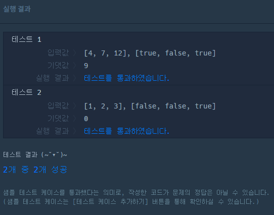 어떤 정수들이 있습니다. 이 정수들의 절댓값을 차례대로 담은 정수 배열 absolutes와 이 정수들의 부호를 차례대로 담은 불리언 배열 signs가 매개변수로 주어집니다. 실제 정수들의 합을 구하여 return 하도록 solution 함수를 완성해주세요.