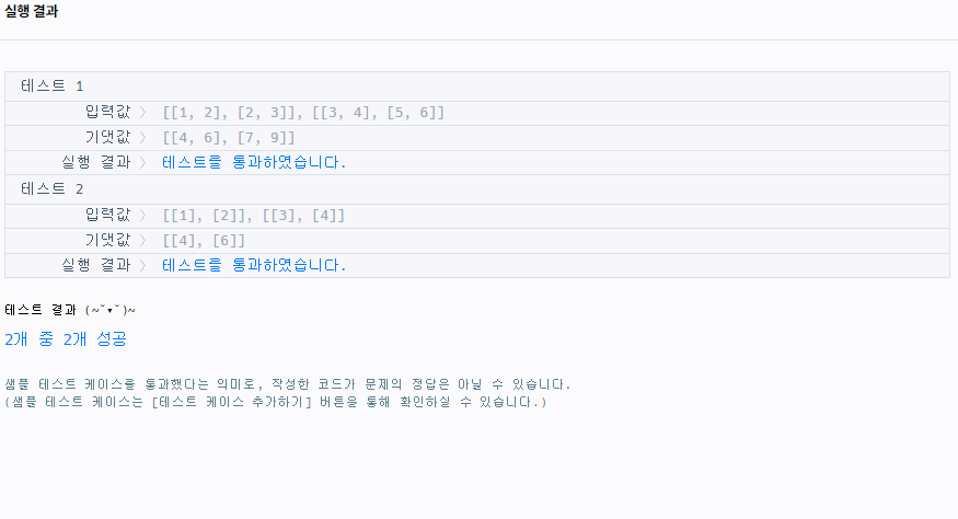 2개의 행렬 arr1과 arr2를 입력받아, 행렬 덧셈의 결과를 반환하는 함수, solution을 완성해주세요.